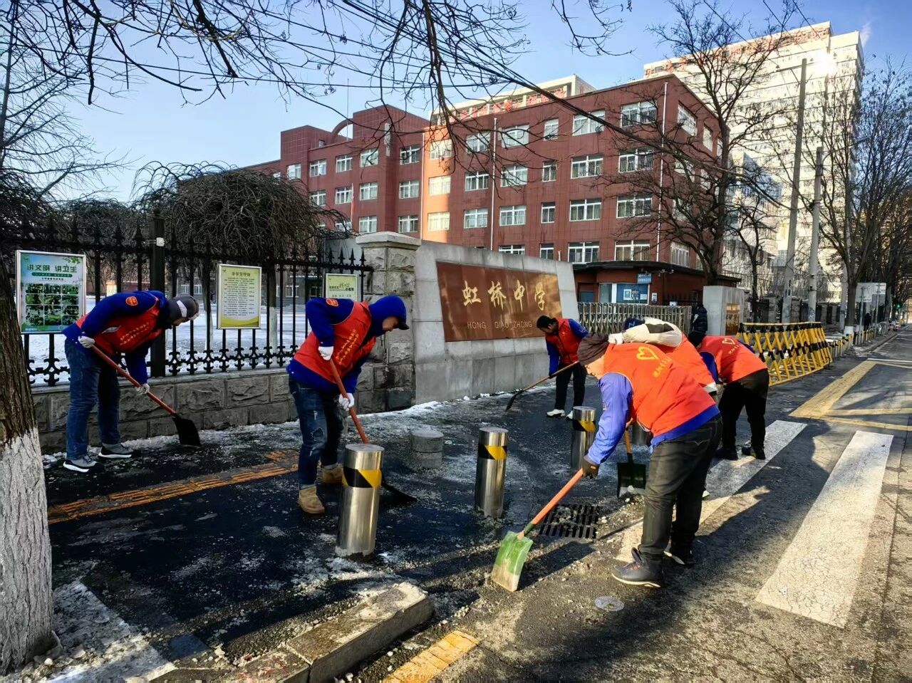 活動當(dāng)天,黨員志愿者們身著紅色馬甲,準(zhǔn)時(shí)集結(jié),參與淮北社區(qū)組織的清冰除雪志愿服務(wù)活動。針對虹橋中學(xué)校門口人行橫道積雪結(jié)冰、易滑難行的問題,志愿者們重點(diǎn)對該區(qū)域展開集中清理。大家手持鐵鍬、雪鏟、掃帚等工具,分工協(xié)作、齊心協(xié)力,將路面積雪與薄冰徹底鏟除清運(yùn)。經(jīng)過一番努力,校門口人行橫道恢復(fù)干凈通暢,通行條件顯著改善,為師生的安全出行提供了堅(jiān)實(shí)保障。